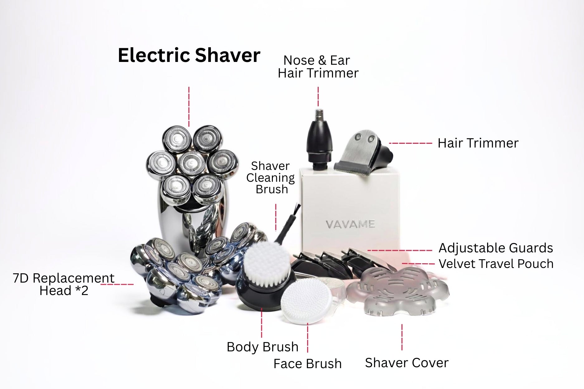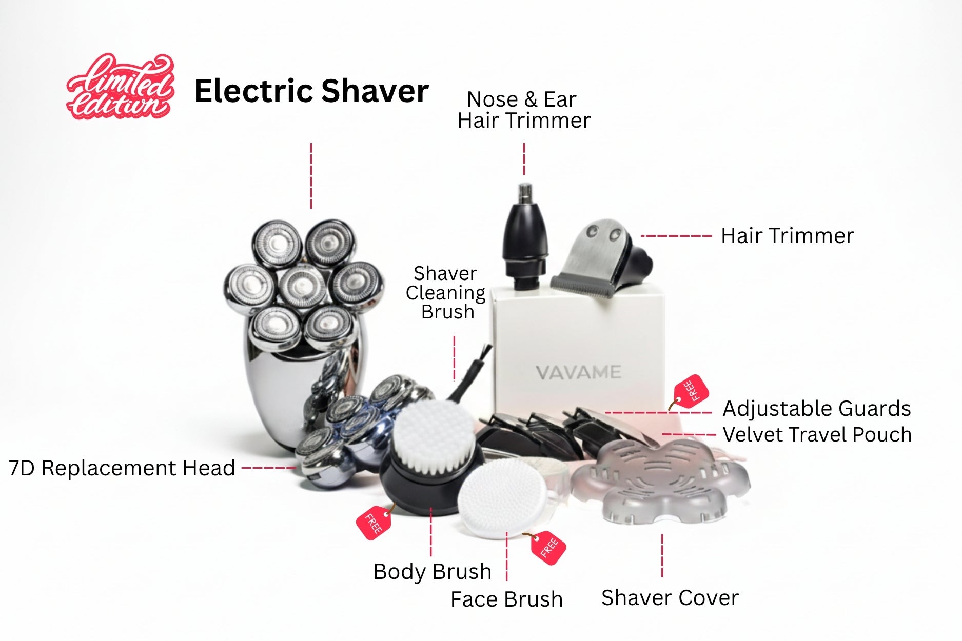 Yes, you can. The Vavame electric shaver comes with a comprehensive shaving kit that includes a dedicated trimmer for nose and ear hair, as well as adjustable guards for head shaving. This versatility allows you to effectively remove hair from any part of your body with ease. Whether you're targeting delicate areas like your nose and ears or maintaining a smooth, bald head, our all-in-one hair removal solution has you covered. Experience the convenience and precision of Vavame’s versatile grooming tools, designed to meet all your hair removal needs in one complete kit.